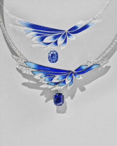 Chaumet a dévoilé un diadème en diamants de sa collection « Envol », accompagné pour la première fois d’un écrin exceptionnel en marqueterie de plumes, réalisé par le plumassier français Julien Vermeulen. Né d’une rencontre au salon Révélations, ce partenariat inédit met en lumière un dialogue exigeant entre deux savoir-faire d’excellence. Conçu pour sublimer le bijou sans lui voler la vedette, l’écrin présente un dégradé de bleus composé de milliers de fragments de plumes posés à la main, nécessitant une soixantaine d’heures de travail. Entièrement fabriqué en France et pensé dans les moindres détails, ce projet illustre la volonté de Chaumet de valoriser les artisans d’art en les associant pleinement à la création.